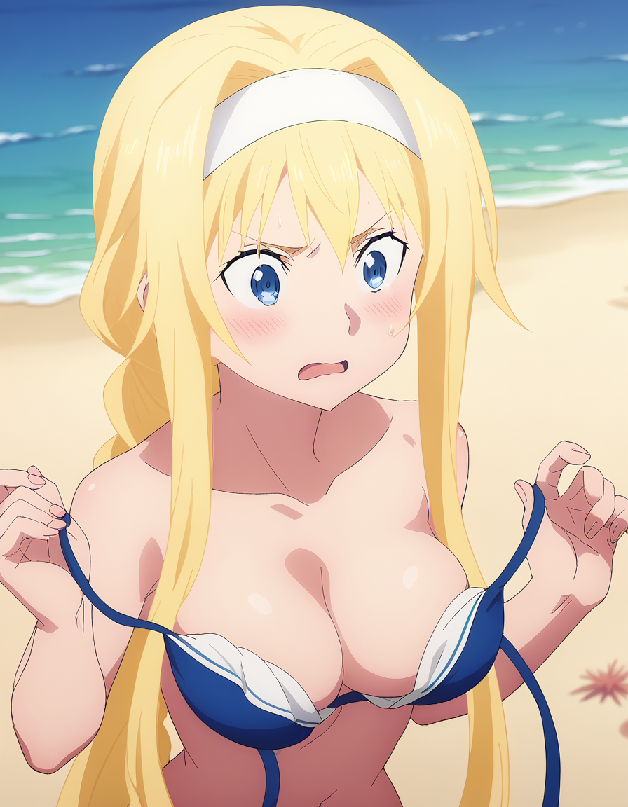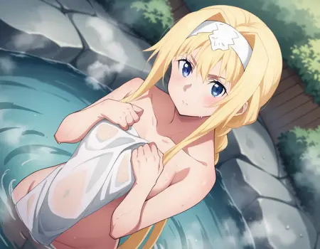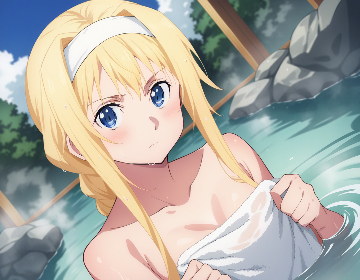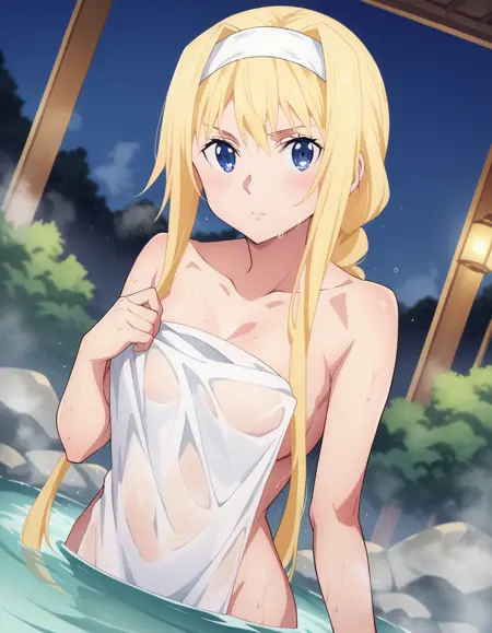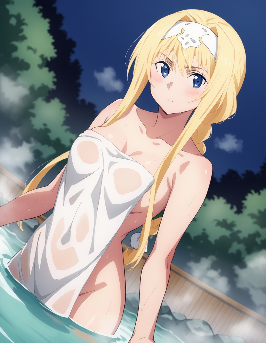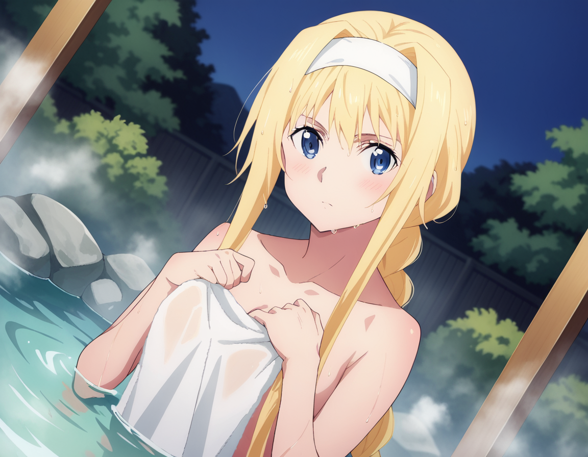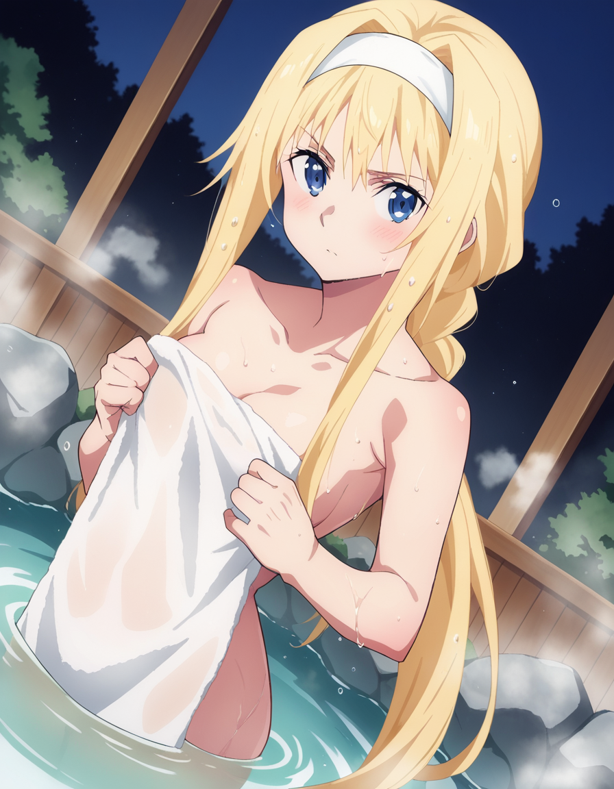 alice zuberg, bangs, blue eyes, blonde hair, hair between eyes, very long hair, braid, hairband, white hairband,