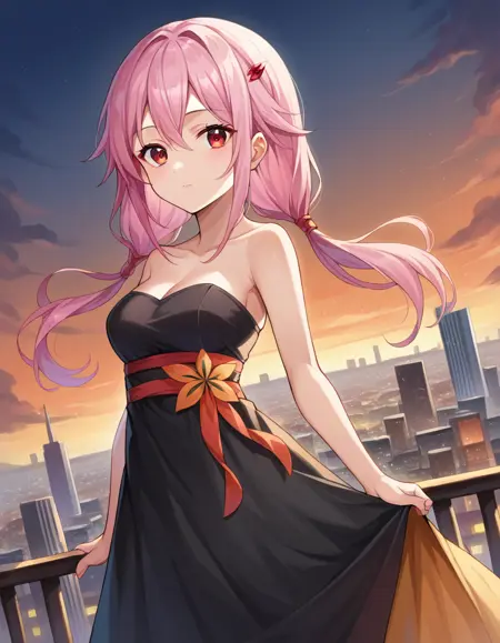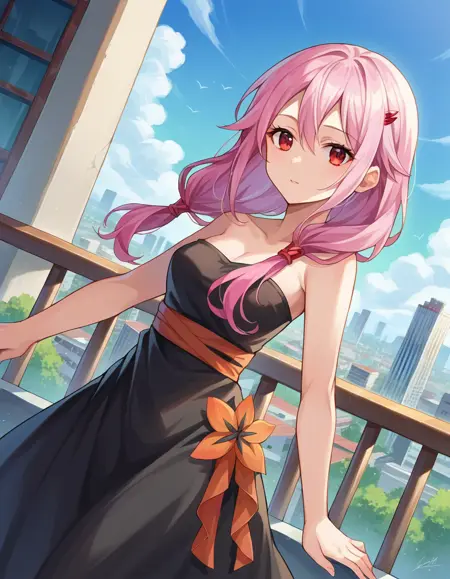 inori yuzuriha, hair ornament, hairclip, long hair, pink hair, red eyes, twintails,