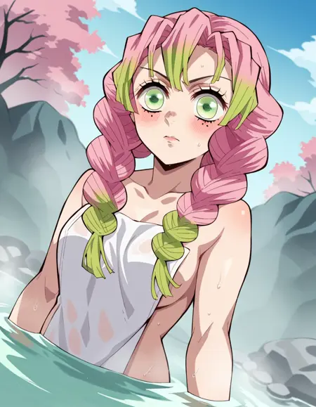 蜜璃·甘露寺,发辫,渐变发色,绿色眼睛,绿发,长发,痣,眼下痣,多色发,粉发,双辫,双色发,