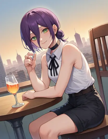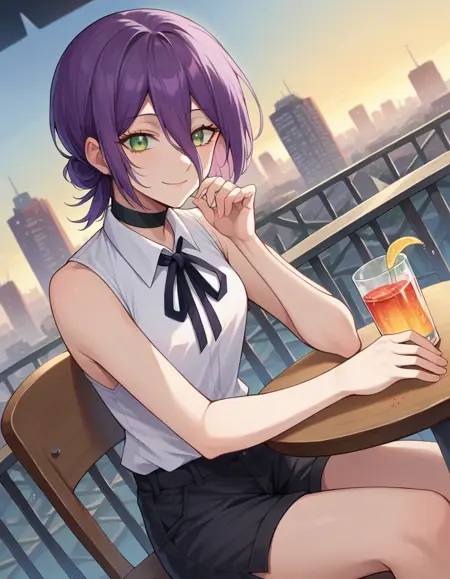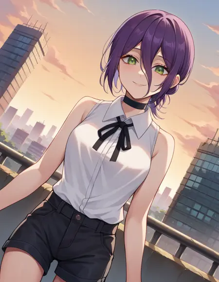 reze,黑色项圈,紫色头发,项圈,头发遮住眉毛,绿色眼睛,头发遮住眼睛,长刘海,中长发,