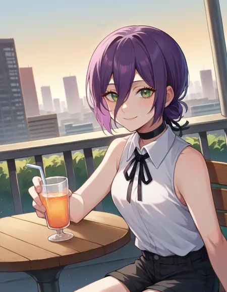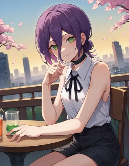 reze, black choker, purple hair, choker, eyebrows hidden by hair, green eyes, hair between eyes, long bangs, medium hair,