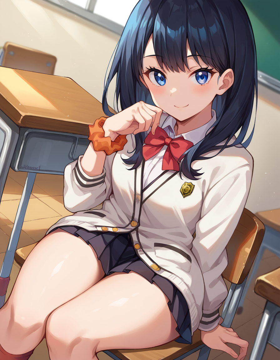 rikka takarada, black hair, blue eyes, long hair, orange scrunchie, scrunchie, wrist scrunchie