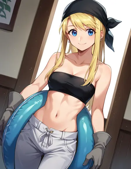 gloves, navel, cleavage, bare shoulders, collarbone, earrings, midriff, pants, stomach, bare arms, strapless, bandana, bandeau, tube top, grey gloves,