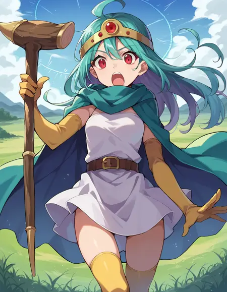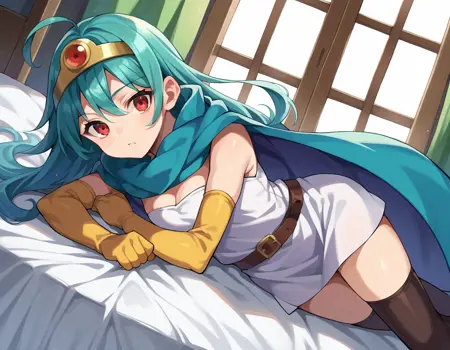 belt, buckle, cape, capelet, circlet, cloak, dress, elbow gloves, gloves, scarf, short dress, sleeveless, sleeveless dress, thighhighs, yellow gloves,