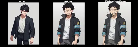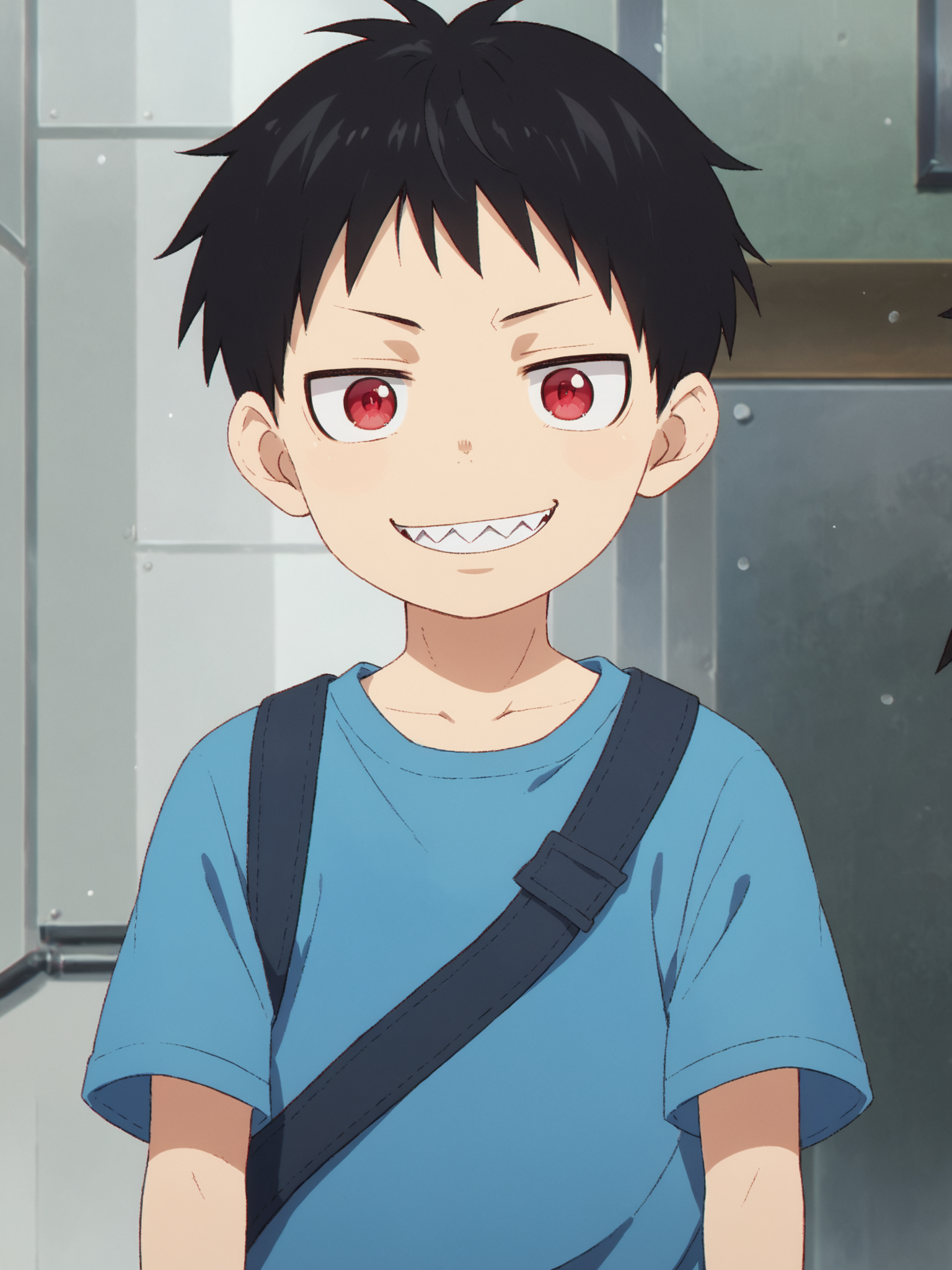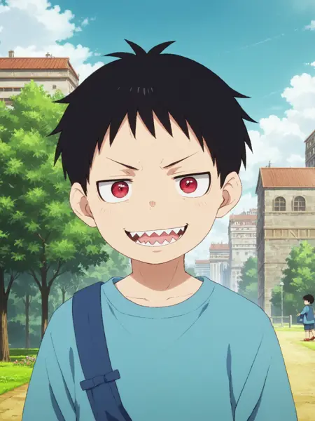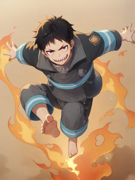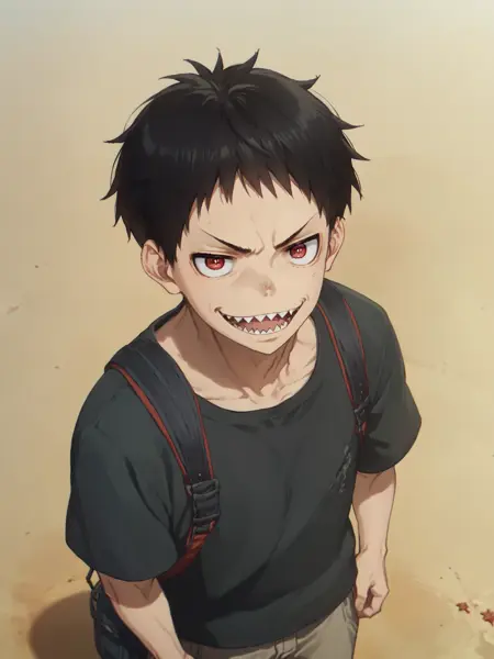 "1boy, Shinra Kusakabe, black hair, red eyes," I recommend all four.