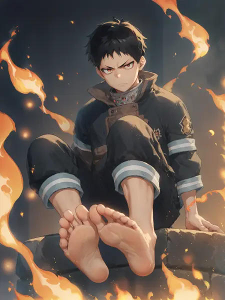 "male, male child, sharp teeth, foot focus, fire at the soles of feet, fire" are also good to use.