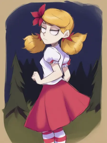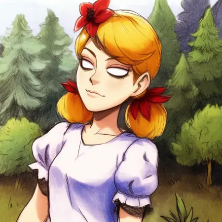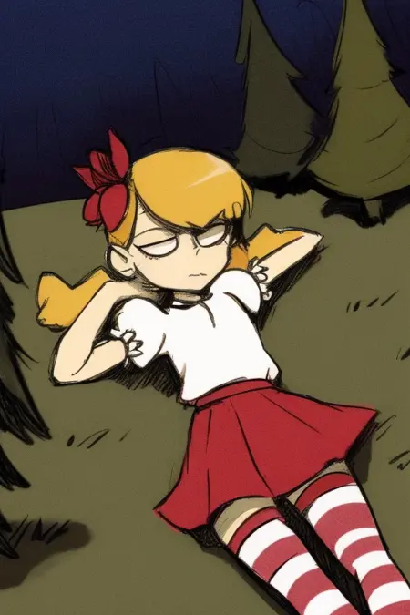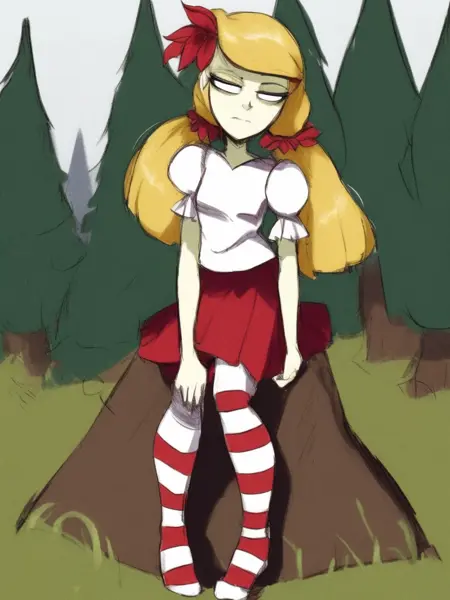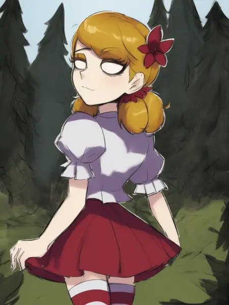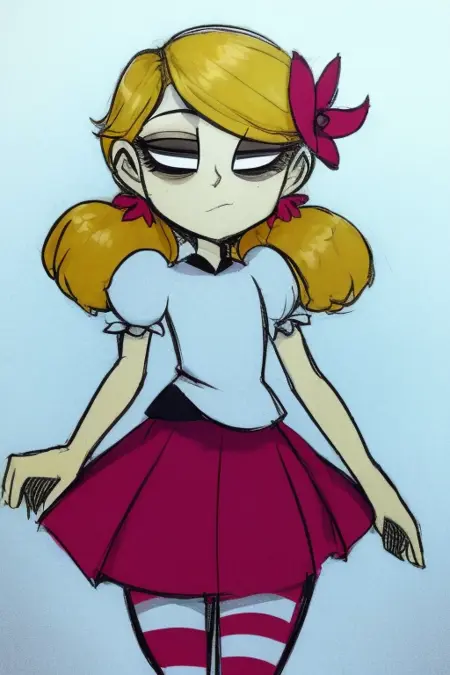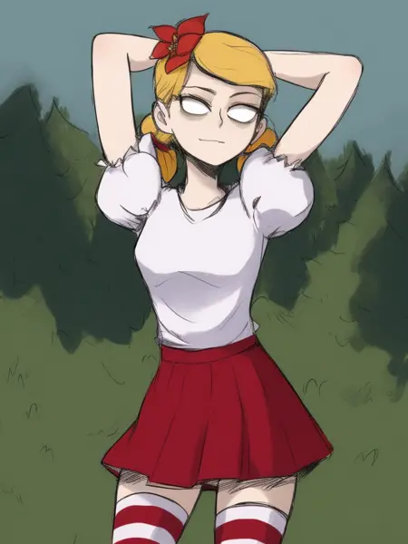 기본 복장: wendydst, 1girl, solo, twintails, 금발 머리, 앞머리, 머리에 꽃, 흰색 셔츠, 짧은 소매, 볼륨 있는 소매, 빨간 치마, 줄무늬 허벅지 양말, 입 닫음, 동공 없음, 흰색 눈, 눈 밑 다크서클, 신발