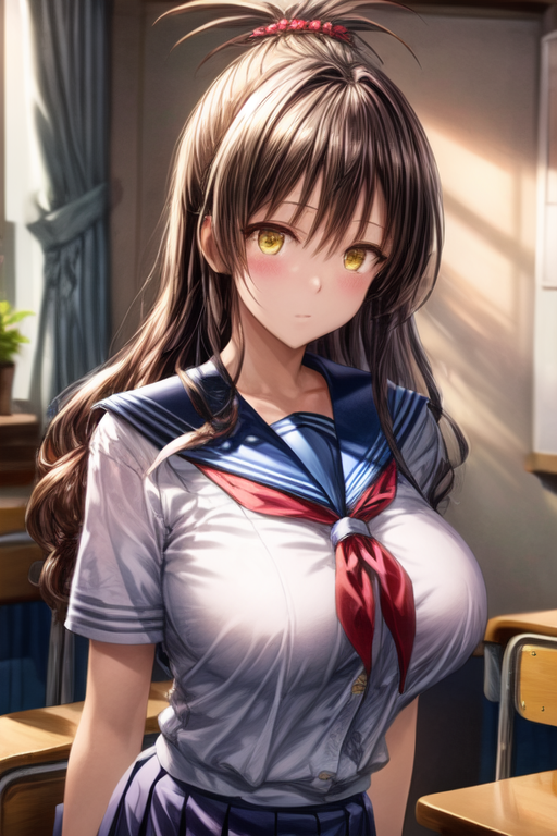 Trigger word: mikan_a, brown hair, yellow eyes, hair ornaments, long hair, topknot, wavy hair, sailor school uniform, sailor collar, plead skirt,
