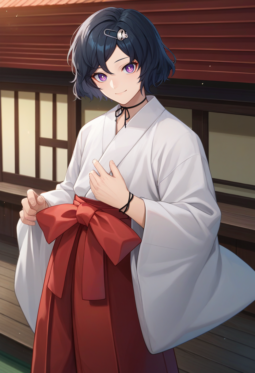 Default Outfit: japanese clothes, white kimono, red hakama, hakama skirt, ribbon choker