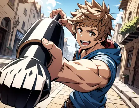 holding weapon,clenched hand,incoming attack,arm cannon,fighting stance,looking at viewer,upper body,dutch angle,辺りを入れるとポーズしてくれます。
