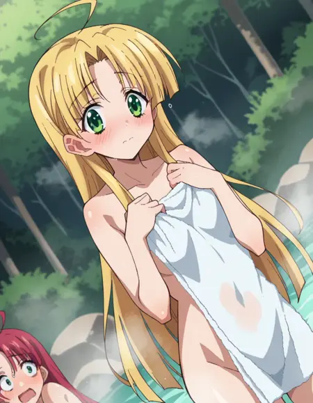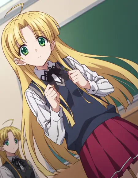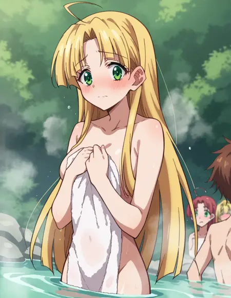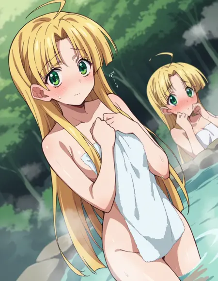 asia argento, long hair, blonde hair, green eyes, parted bangs, ahoge,