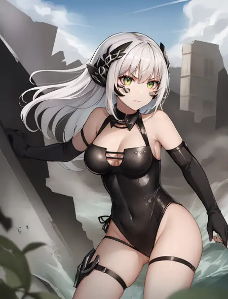 <lora:GagerNormal:1>,1girl,gagernormal,green eyes,white hair,sangvis ferri,elbow gloves,leotard,thigh strap,kneehighs,long hair,headgear,