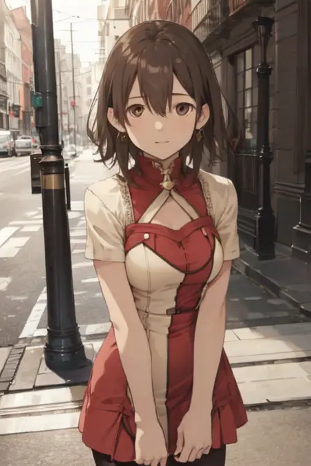 MiyukiItsumi, 1girl, solo, short hair, brown hair, dress, brown eye, black pantyhose,