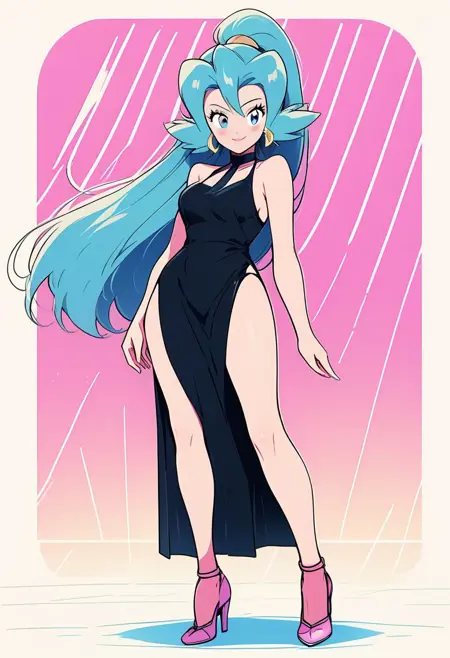 dress, bare shoulders, jewelry, closed mouth, standing, earrings, sleeveless, black dress, bare legs, sleeveless dress, side slit, hoop earrings, pink high heels,