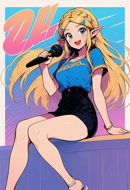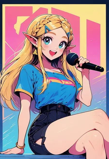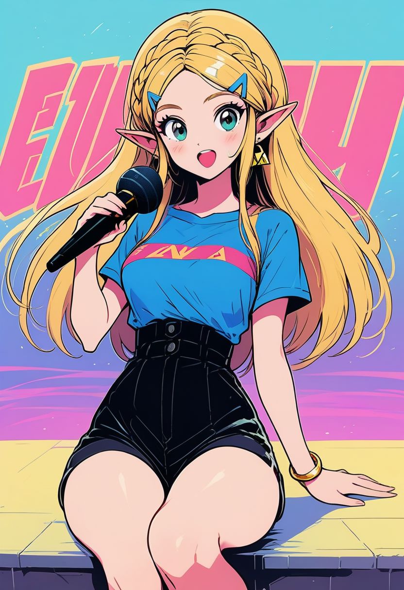 shirt, holding, jewelry, sitting, full body, short sleeves, earrings, shorts, striped, collared shirt, bracelet, short shorts, bare legs, black shorts, sandals, microphone, shirt tucked in, holding microphone, high-waist shorts,
