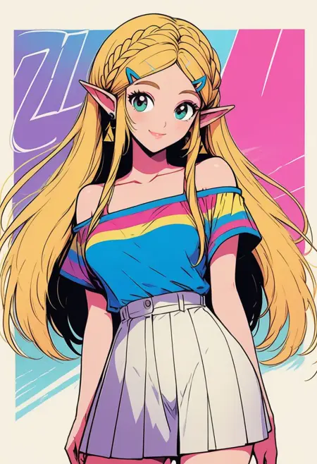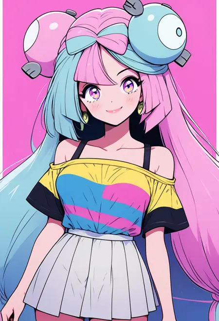 skirt, shirt, bare shoulders, jewelry, collarbone, short sleeves, cowboy shot, pleated skirt, earrings, striped, off shoulder, makeup, white skirt, off-shoulder shirt, shirt tucked in, multicolored shirt,