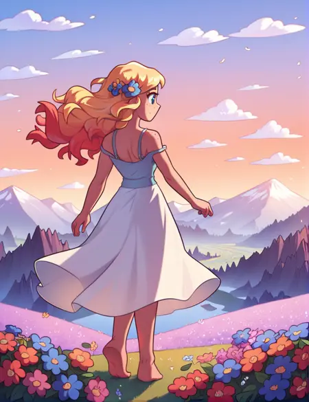 score_9, score_8_up, score_7_up, 1girl, 金发, 发间插花, 背部雀斑, 卷发, 夏裙, 赤脚, 细肩带拖鞋, 草原, 远处山脉, 花朵, 微风