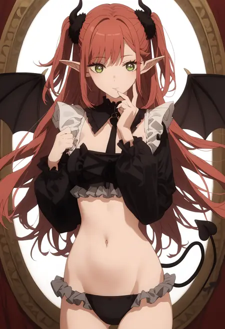 Kitagawa Marin, 1girl, red hair, two side up, long hair, green eyes, pointy ears, demon horns, navel, demon tail, demon wings, crop top, long sleeves, frilled shirt collar, frilled panties