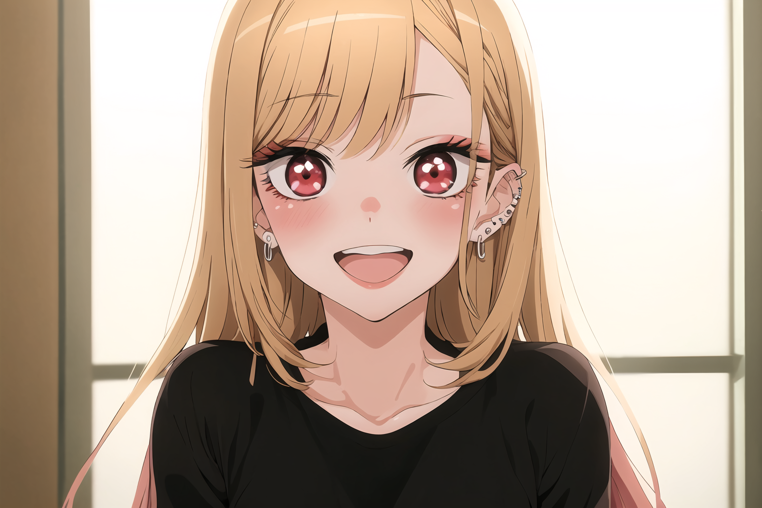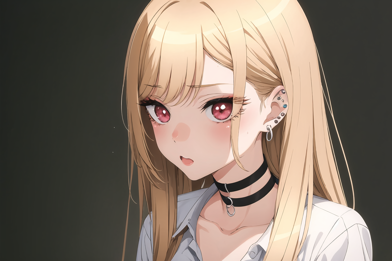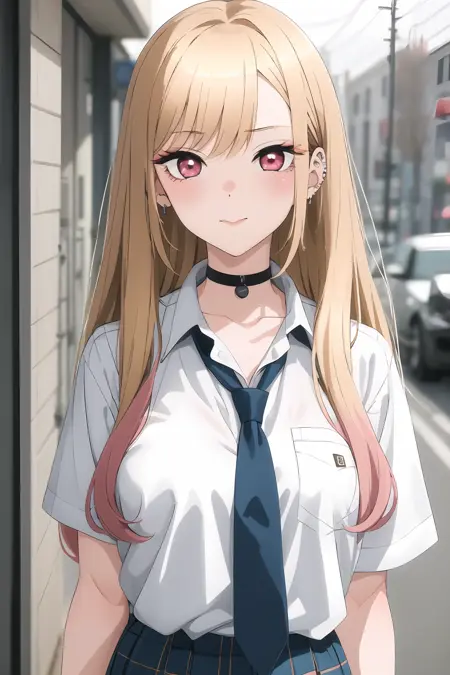 Kitagawa Marin,1girl, blonde hair, long hair, multicolored hair, red eyes, jewelry, earrings, piercing, school uniform, white shirt, tied shirt, black choker, blue necktie, plaid skirt