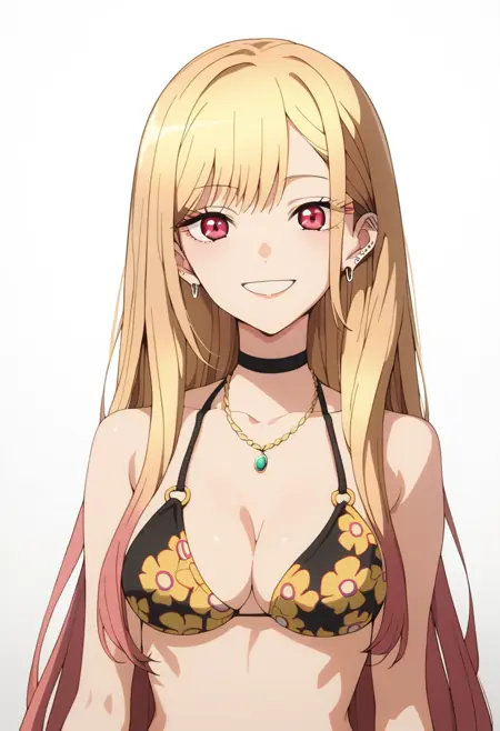 Kitagawa Marin,1girl, blonde hair, long hair, multicolored hair, red eyes, jewelry, necklace, choker, black bikini, floral print, bracelet, side-tie bikini bottom