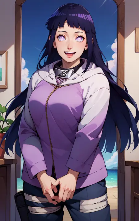 提示词:hinataSDXL, 1girl, solo, long hair, looking at viewer, smile, open mouth, room background, black hair, purple eyes, :d, pants, hood, hood down, white eyes, forehead protector, konohagakure symbol, hyuuga hinata,
