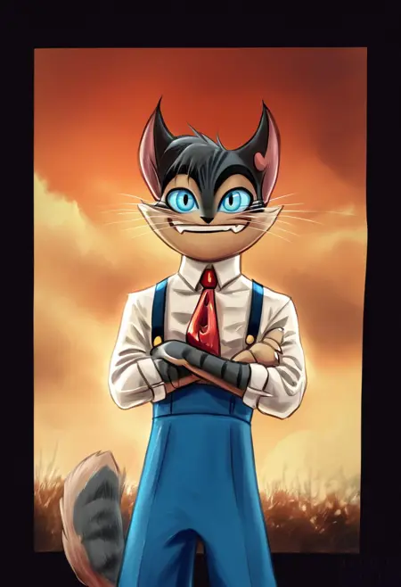 Rocky, Rocky Rickaby, blue eyes, striped fur, striped, pointed ears, eyebrows, smiling, yellow markings, grey body, grey fur, tail, long tail, blue sclera, black ears, cat ears, black cat ears, (male anthro cat:1.3),