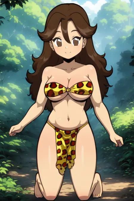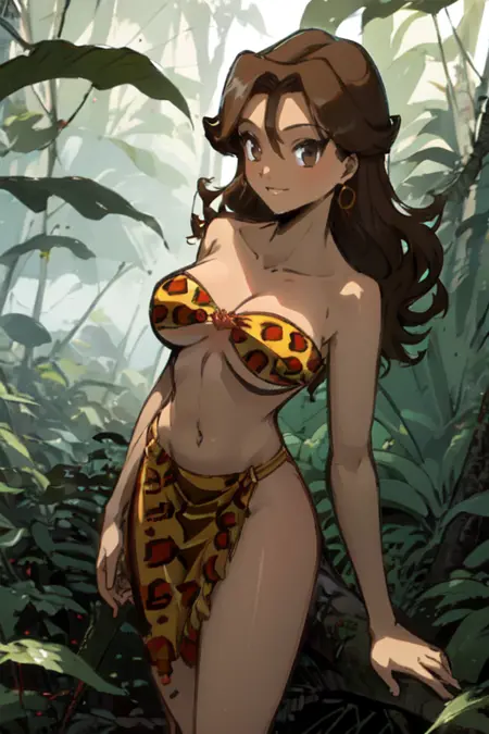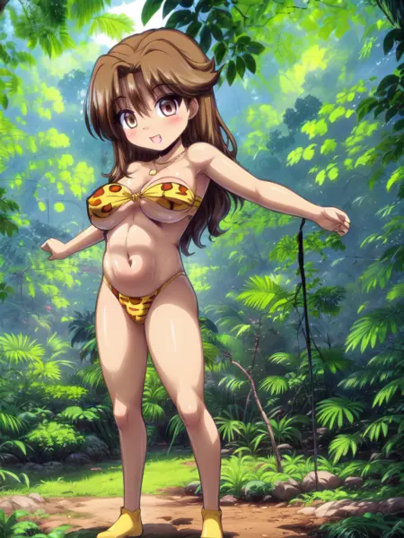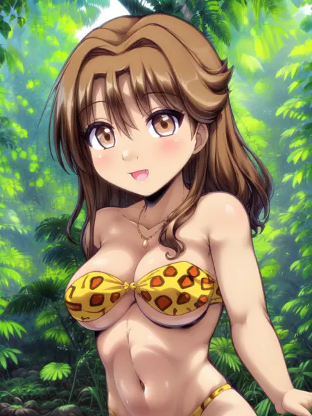 ((项链))),(((闪亮的身体))),(((闪亮的皮肤))),前系式胸衣,(((下乳))),(((腰腹))),1girl,单独,长发,看着观众,脸红,(((棕色头发))),肚脐,眼睛间的头发,裸露的肩膀,棕色眼睛,紫色眼睛,锁骨,泳装,无肩带,比基尼,中等大小乳房,户外,虎牙,V形眉毛,自然,黄色比基尼,老虎纹,印花比基尼,(((丛林背景))),动物纹,(((全身))),(((电影感镜头)))