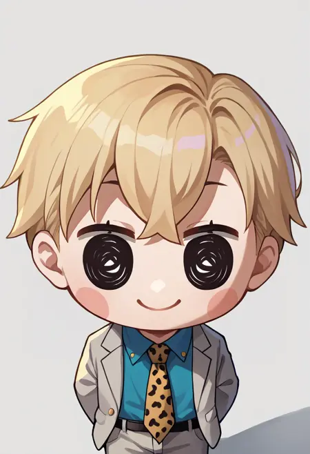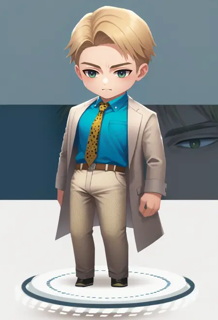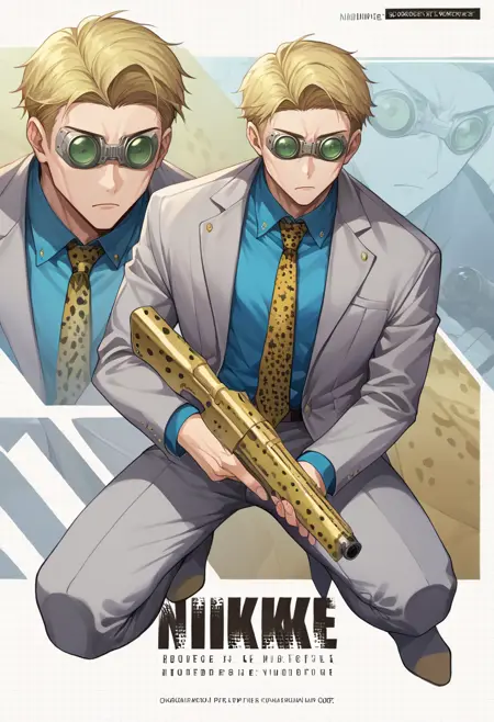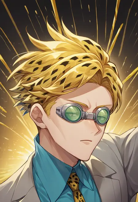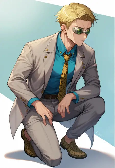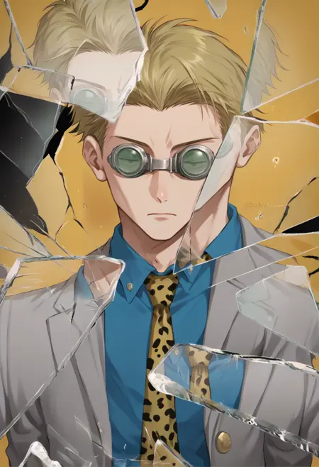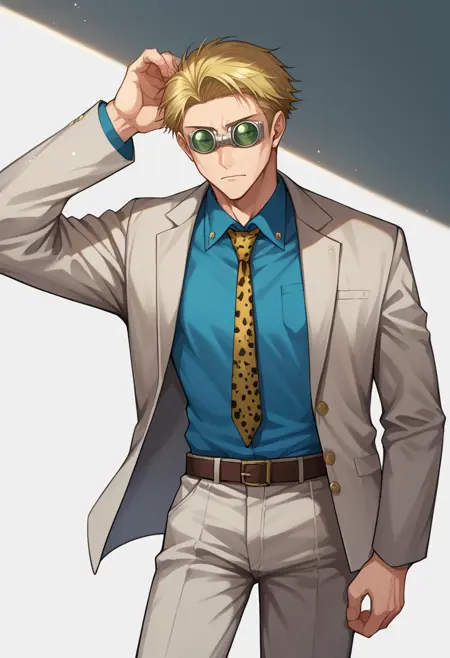 NanamiBase, blonde hair, short hair, goggles, grey jacket, yellow necktie, leopard print, blue shirt, collared shirt, grey pants