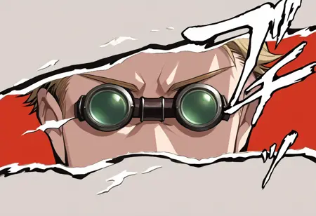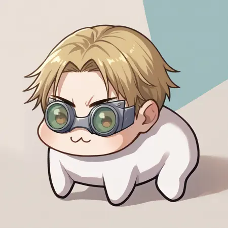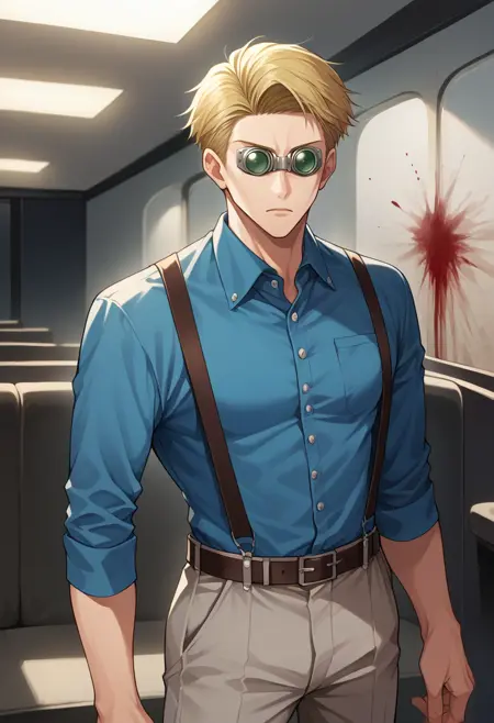 NanamiBase, blonde hair, short hair, goggles, blue shirt, collared shirt, suspenders, grey pants