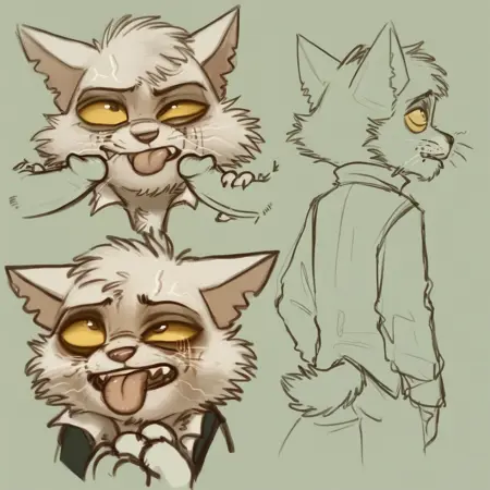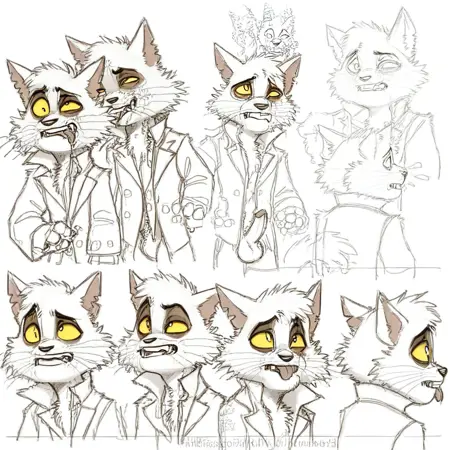 "Virgil[lackadaisy], Virgil, White cat, white body, thin eyebrows, eyebrows, messy fur, furry, no humans, rip in ear, eye bags, messy hair, fluffy, feline, feline ears, cat, cat ears, scar over eye, scars, yellow sclera, black pupils, (Male Anthro Cat:1.5)"