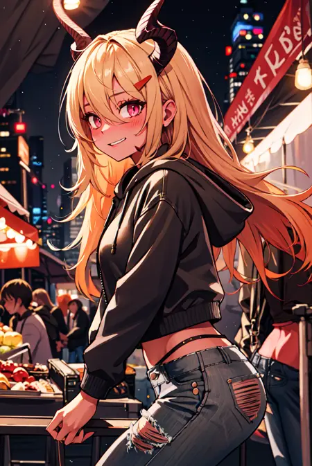 タグ:bbeth、悪魔の角、首輪、ブラックビキニ、炎の目、開いたジャケット、短いショーツ、装甲ブーツ