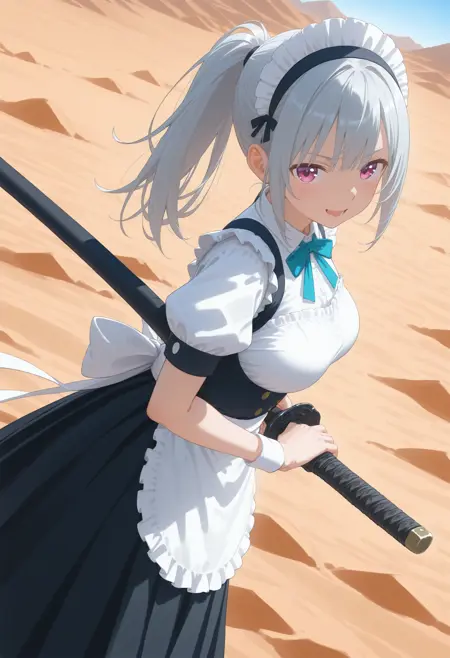 トリガーワードは iaidou なのですが、要素があっちこっちに散らばっちゃったので weapon, katana, holding sword, ready to draw, sheathed, unsheathing, scabbard, fighting stance, battoujutsu stance 辺りから全部または適当に抜いて入れて下さい。
