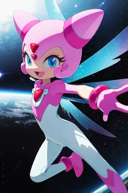 Lumina Flowlight, blue eyes, fairy, wings, pink headgear, pink gloves, ring bracelets,