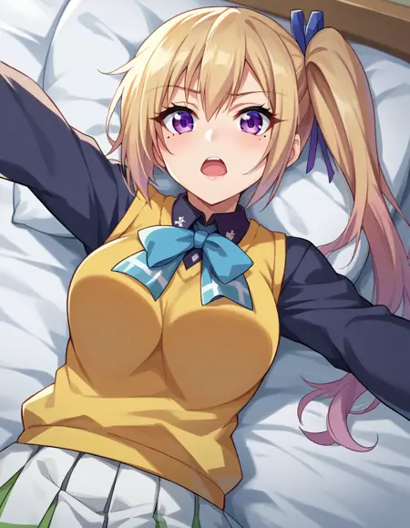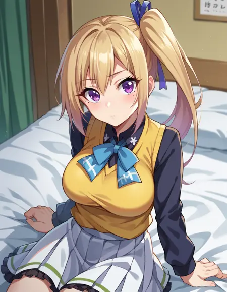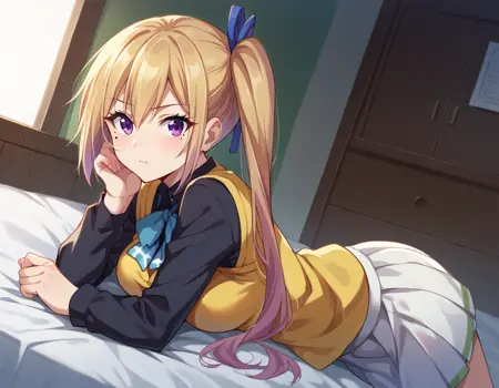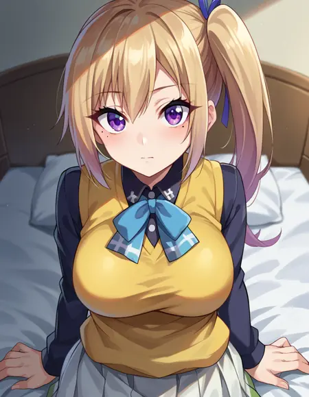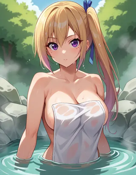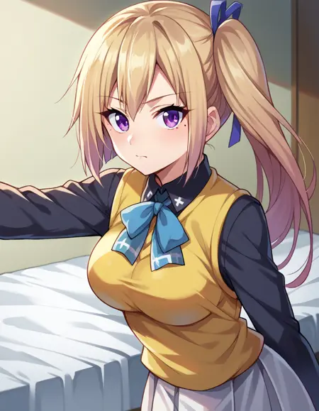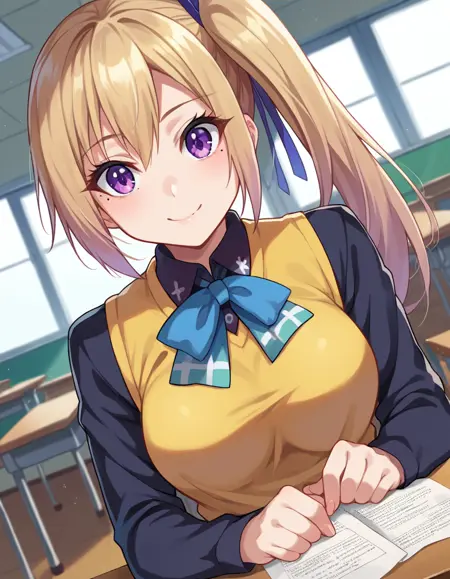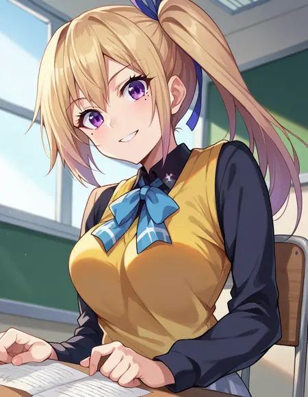 mai kawakami, blonde hair, hair ribbon, long hair, mole, mole under eye, ribbon, side ponytail, purple eyes