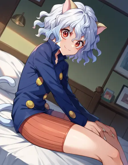 neferpitou, 단발, 빨간 눈, 동물 귀, 꼬리, 흰색 머리, 고양이 귀, 고양이 꼬리, 곱슬머리,
