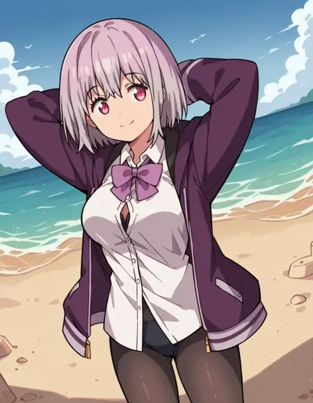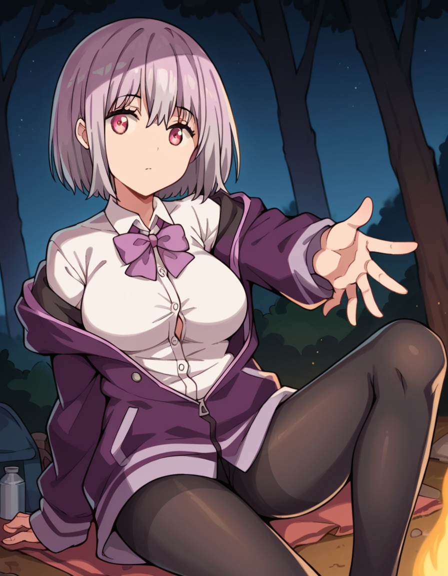 black pantyhose, bow, collared shirt, hood, hooded jacket, jacket, open clothes, open jacket, open shirt, pantyhose, purple bow, purple jacket, school uniform, shirt, sleeves past wrists, unbuttoned shirt, white shirt,