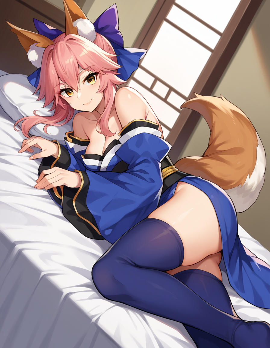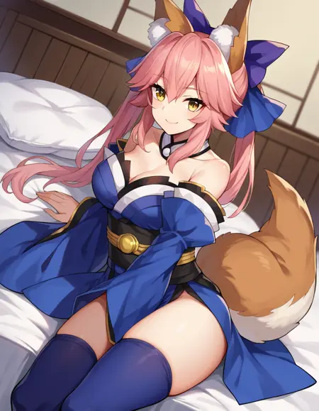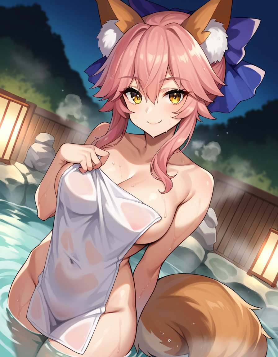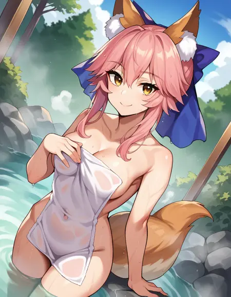 tamamo, animal ear fluff, animal ears, fox ears, fox girl, fox tail, hair ribbon, pink hair, tail, yellow eyes,