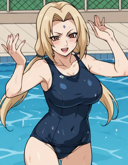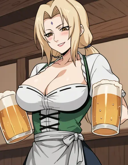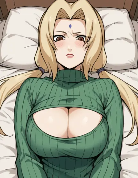 tsunade, blonde hair, yellow hair, facial mark, forehead mark, long hair, makeup, mature female, brown eyes, parted bangs, twintails, low twintails,