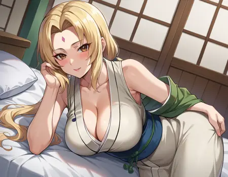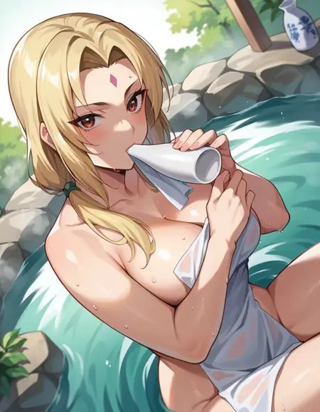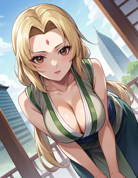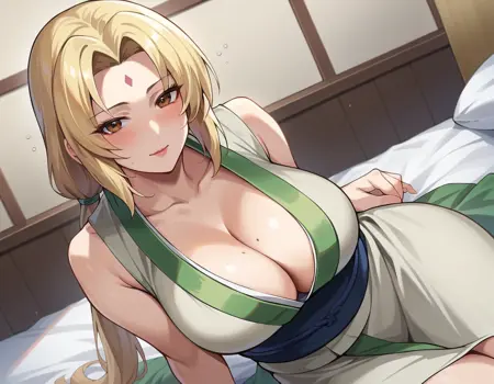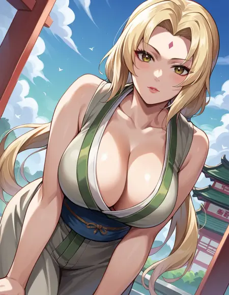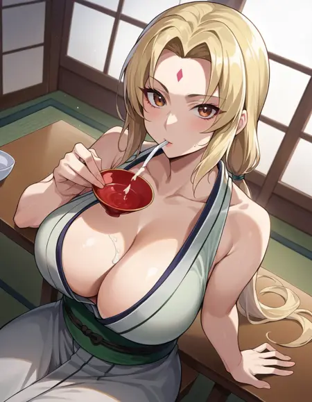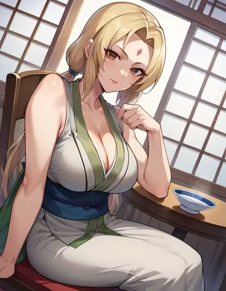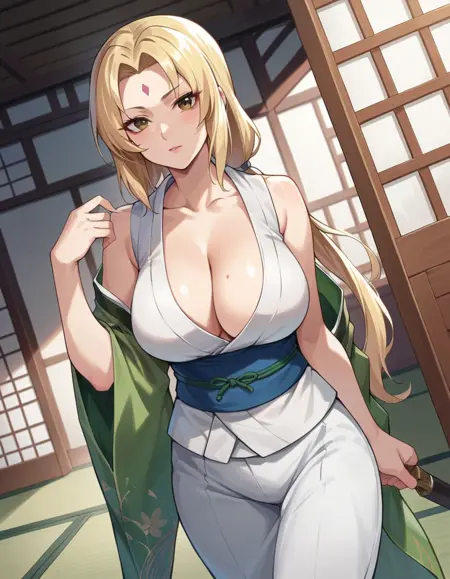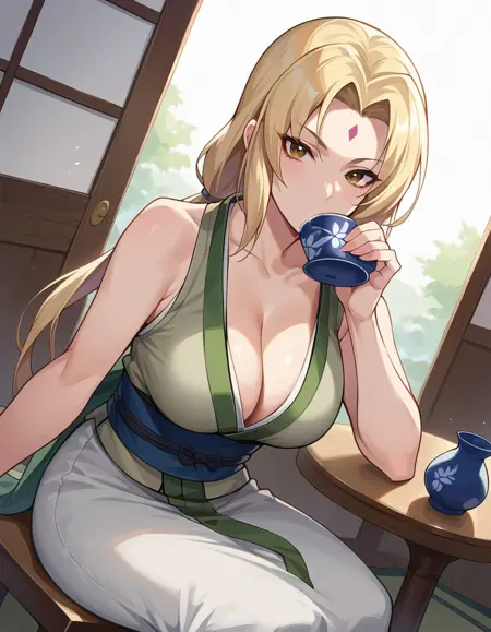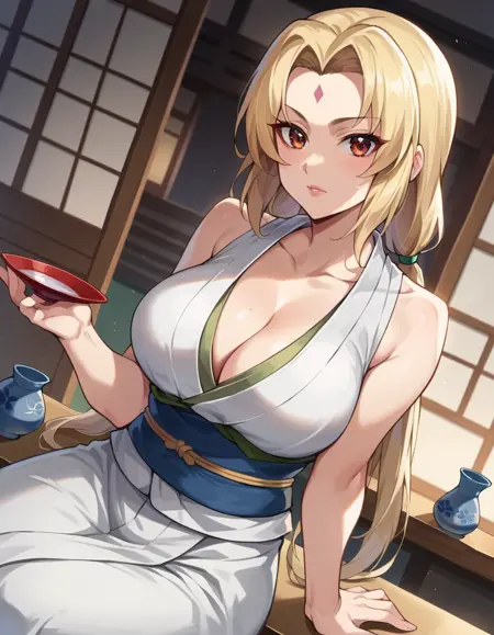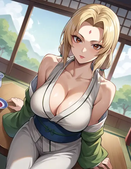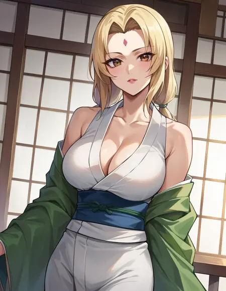 tsunade, blonde hair, yellow hair, facial mark, forehead mark, long hair, makeup, mature female, brown eyes, parted bangs, twintails, low twintails,