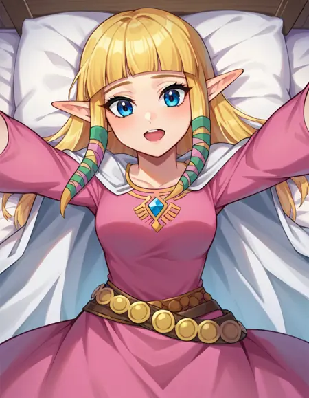 zelda skyward sword、金髪、青い目、長い髪、尖った耳、サイドロックス、エルフ、前髪、まっすぐな前髪、リボン、髪のリボン、