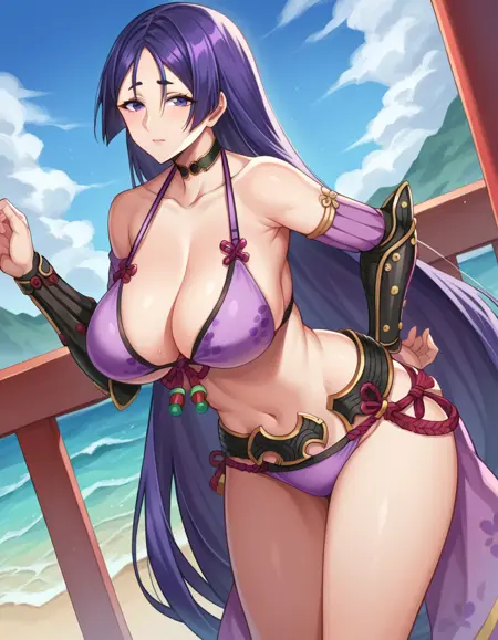 arm guards, armor, belt, bikini, choker, collarbone, navel, purple bikini, stomach, swimsuit, thighs,