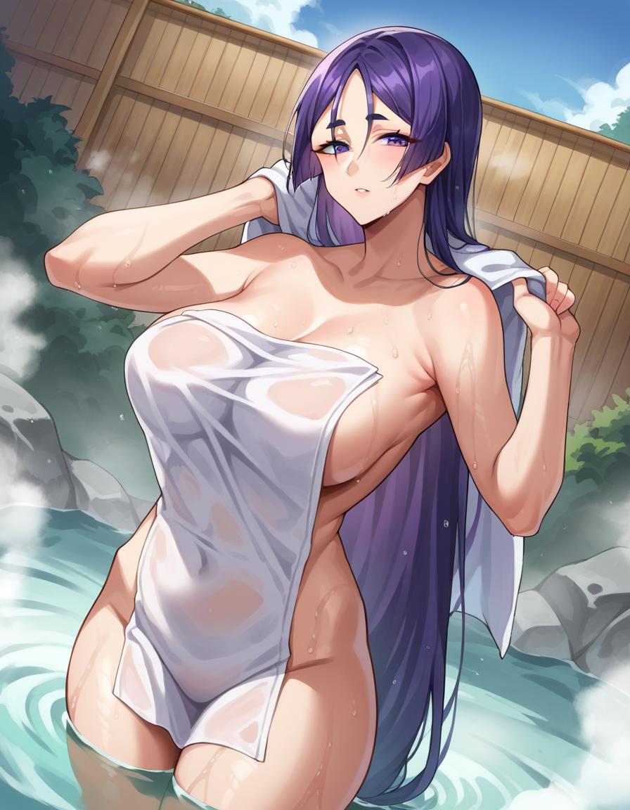 raikou, parted bangs, purple eyes, purple hair, long hair, hime cut, forehead,