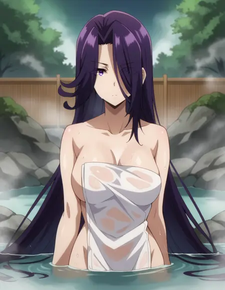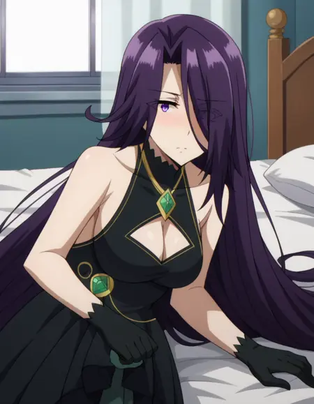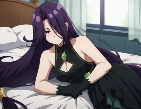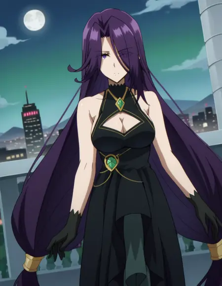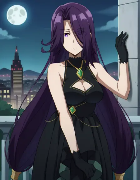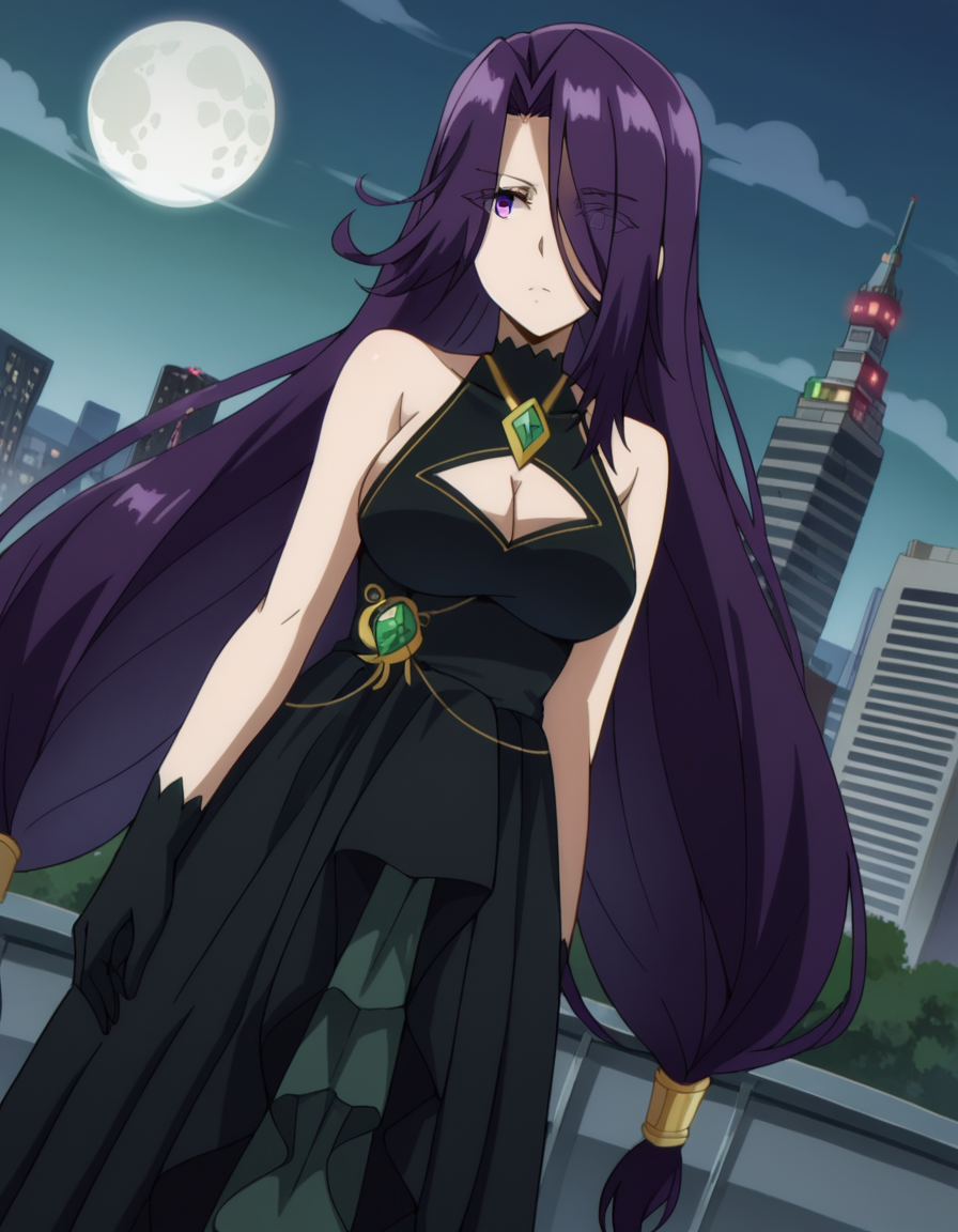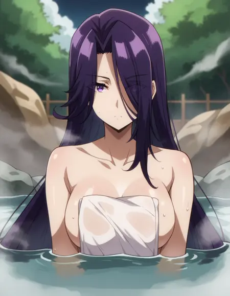 aurora, long hair, purple hair, very long hair, purple eyes, hair over one eye, eyes visible through hair,