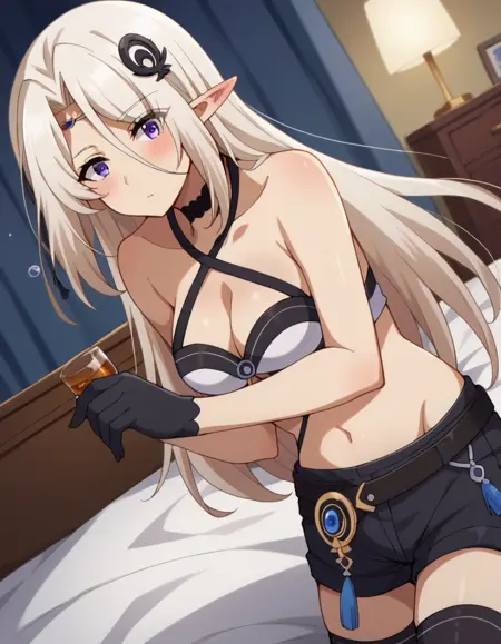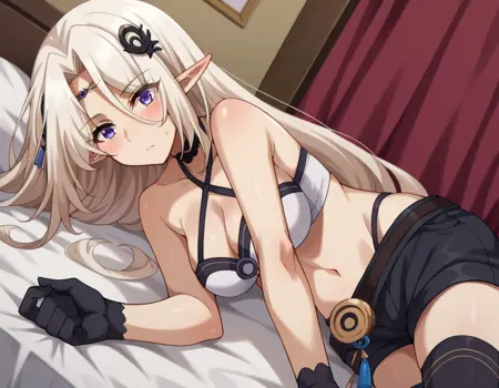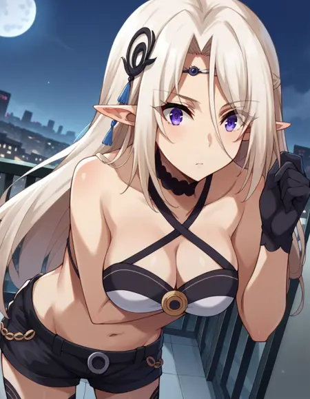 thighhighs, gloves, navel, shorts, choker, black gloves, short shorts, black shorts, cleavage, bare shoulders, halterneck, criss-cross halter,