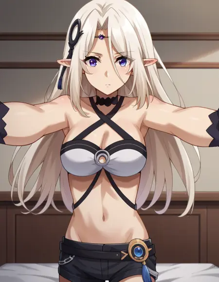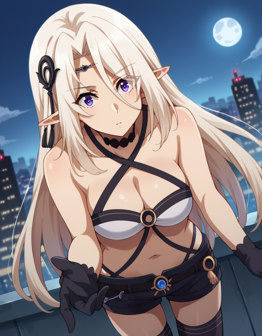 beatrix, long hair, bangs, purple eyes, white hair, pointy ears, elf, sheath, eyes visible through hair, hair ornament,