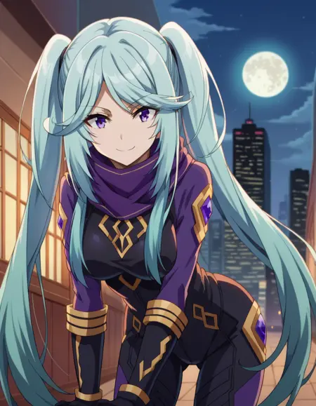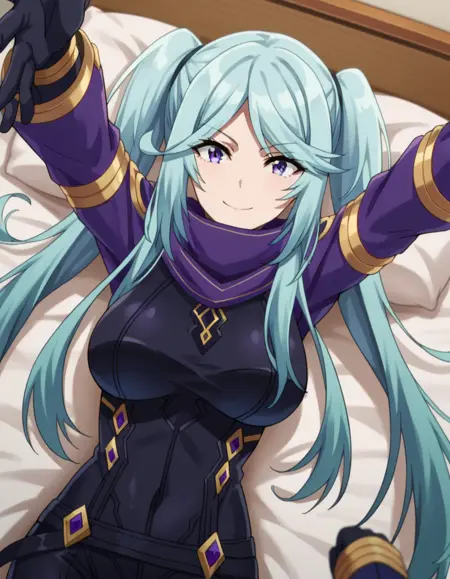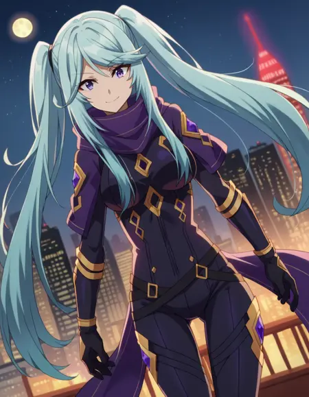ボディスーツ, スCARF, 紫のスカーフ, 手袋, 黒の手袋,