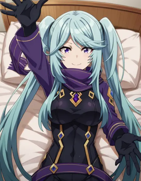 bodysuit, scarf, purple scarf, gloves, black gloves,