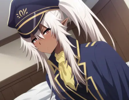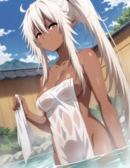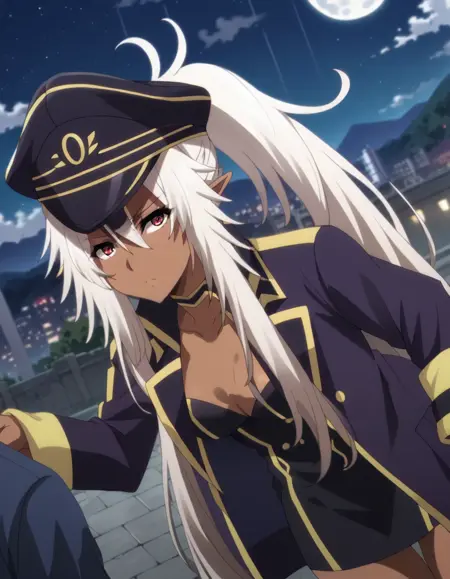 lambda, long hair, white hair, pointy ears, dark skin, dark-skinned female, sidelocks, ponytail, red eyes,
