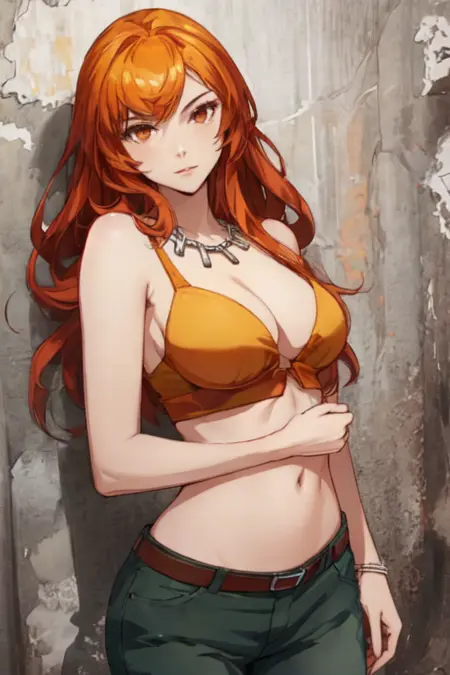 JoyShenmue, 1girl, solo, long hair, large breasts, navel, cleavage, bare shoulders, brown eyes, jewelry, midriff, belt, necklace, orange hair, crop top, denim, jeans