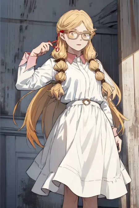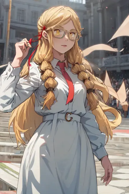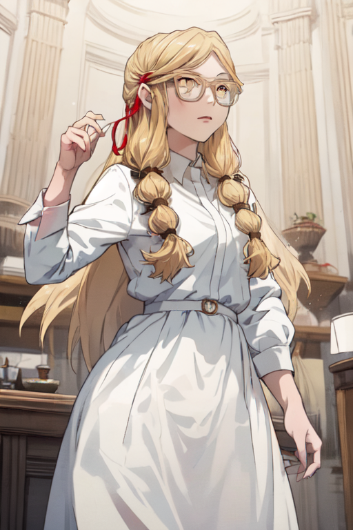PoBidauTiara, 1girl, solo, very long hair, blonde hair, long sleeves, white dress, red ribbon, hair ribbon, yellow eyes, glasses, collared dress,